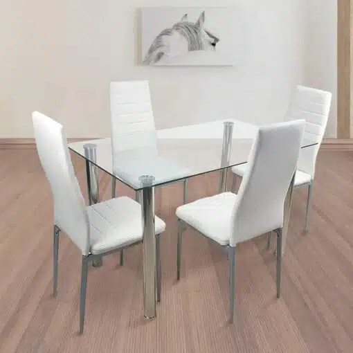 העיצוב המודרני והנקי של פינת האוכל HM0304 מתאפיין בשולחן עם פלטת זכוכית מוחסמת איכותית בעובי 8 מ"מ, בשילוב עם 4 כסאות מרופדים בדמוי עור לבן יוקרתי ורגלי מתכת אל-חלד בציפוי ניקל כרום. הסט מיוצר מחומרים איכותיים ועמידים, מה שמבטיח חוזק ויציבות לשנים רבות של שימוש יומיומי.