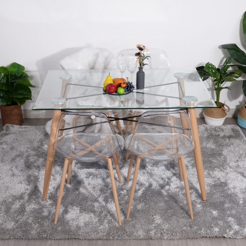 שולחן פינת אוכל מודרני . פלטת השולחן עשויה מזכוכית מחוסמת בעובי 8 מ"מ , רגלי השולחן עשויות מעץ איכותי חזק ועמיד.