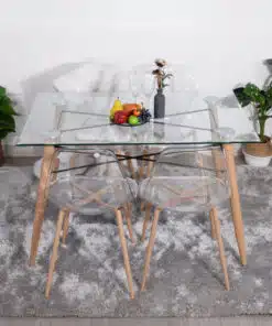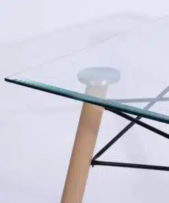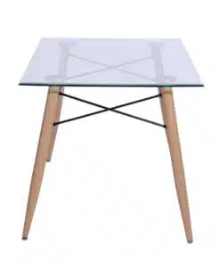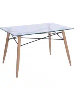 שולחן פינת אוכל מודרני . פלטת השולחן עשויה מזכוכית מחוסמת בעובי 8 מ"מ , רגלי השולחן עשויות מעץ איכותי חזק ועמיד.