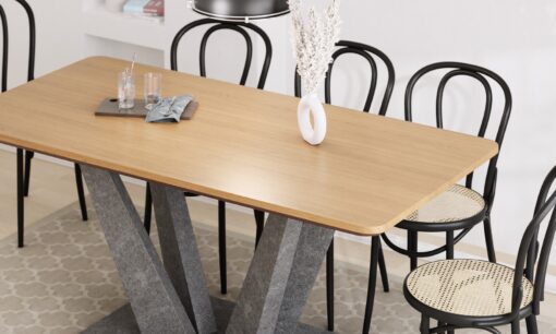 פלטת השולחן בגוון אלון טבעי, עם ארבע רגליים מעוצבות בגוון בטון חזקות ויציבות. השולחן עשוי מעץ מתועש עם חיפוי מלמין יצוק בגימור מושלם.