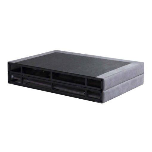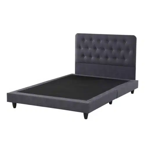 מיטה זוגית איכותית מרופדת בבד אפור איכותי עמיד וקל לניקוי. בסיס המיטה עשוי ממתכת אל חלד חזקה ויציבה. בראש המיטה עשוי מאם די אף מרופד בספוג איכותי ועמיד ובד קל לניקוי ונעים למגע. רגלי המיטה עשויות פלסטיק קשיח בצבע חום.