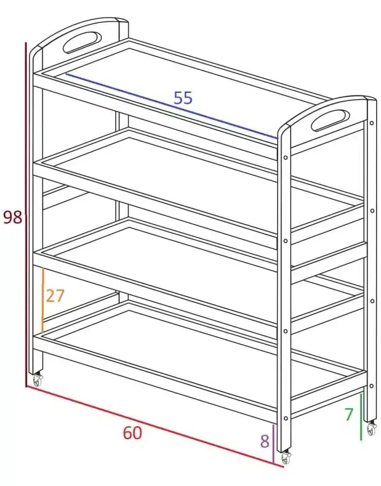 העגלה מתוכננת במידות אופטימליות של 98 ס"מ גובה, 60 ס"מ רוחב ועומק של 33 ס"מ, מה שמאפשר לה להשתלב בקלות גם במעברים צרים או לצד משטחי עבודה קיימים. השימוש בגלגלי סיליקון שקטים מאפשר תנועה חלקה על כל סוגי הרצפות ללא השארת סימנים.