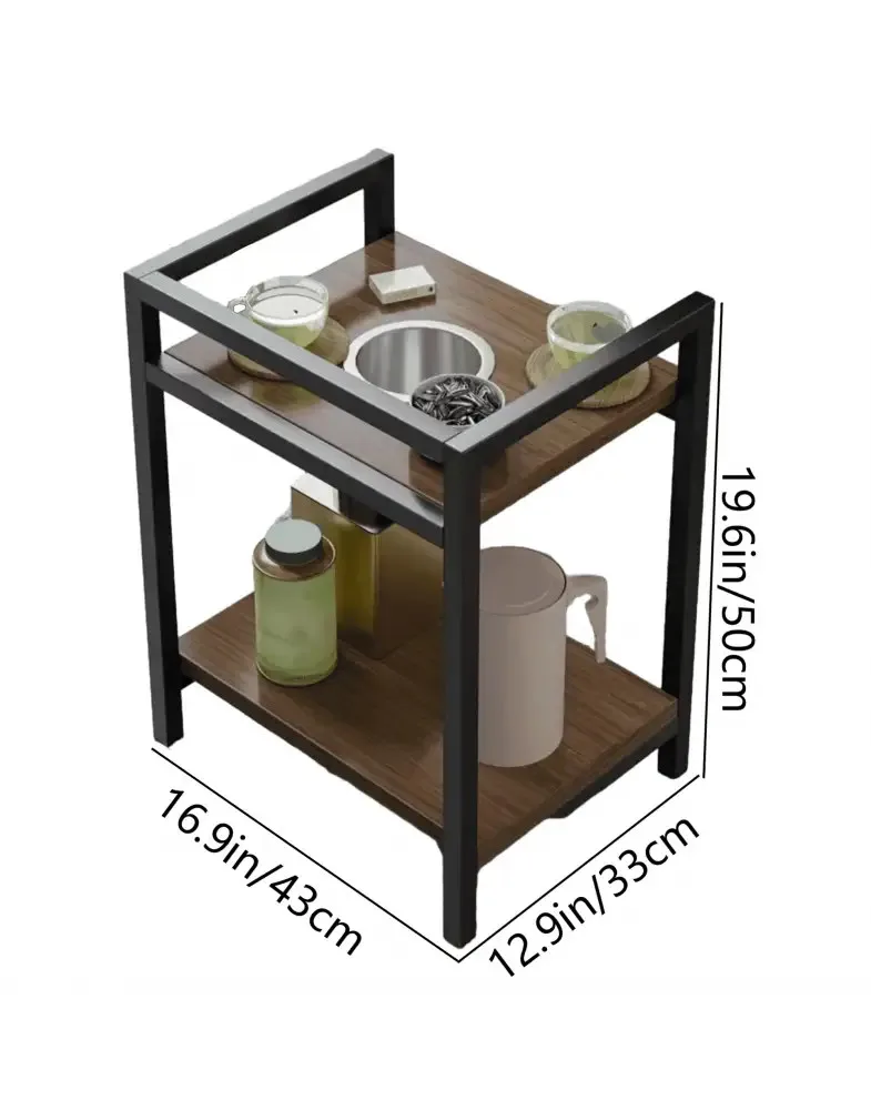 עיצוב פונקציונלי: שתי קומות אחסון בגימור עץ חמים עם שלדת מתכת יציבה בצבע שחור. המדף העליון כולל פח אשפה/מאפרה מובנה לאחסון שקיות תה או פריטים קטנים.