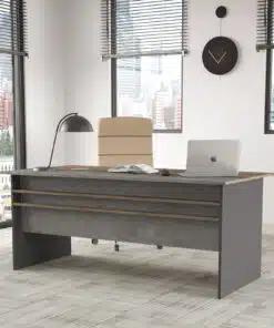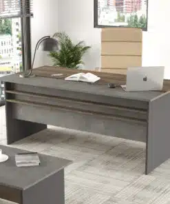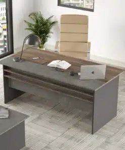 שולחן מנהלים רוחב 180 ס"מ בצבע אפור משולב גוון עץ אגוז. השולחן עשוי מעץ מתועש עם חיפוי מלמין יצוק.