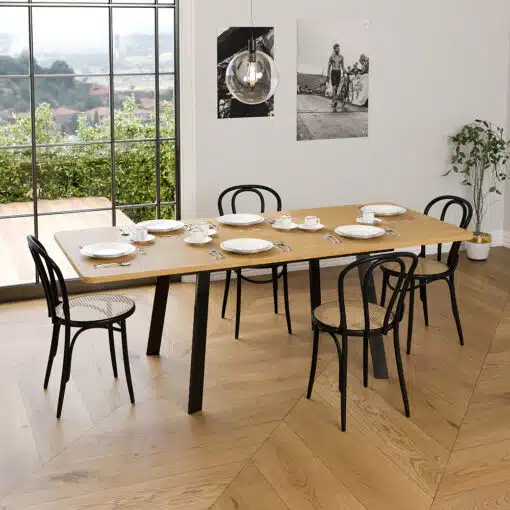 השולחן בנוי משבבי עץ דחוסים איכותיים המצופים במלמין יוקרתי ועמיד, המעניק טקסטורת עץ טבעית ומרשימה. ארבע רגלי המתכת החזקות מספקות יציבות מקסימלית תוך חיסכון במקום מתחת לשולחן, ומאפשרות נוחות מרבית לכל הסועדים.