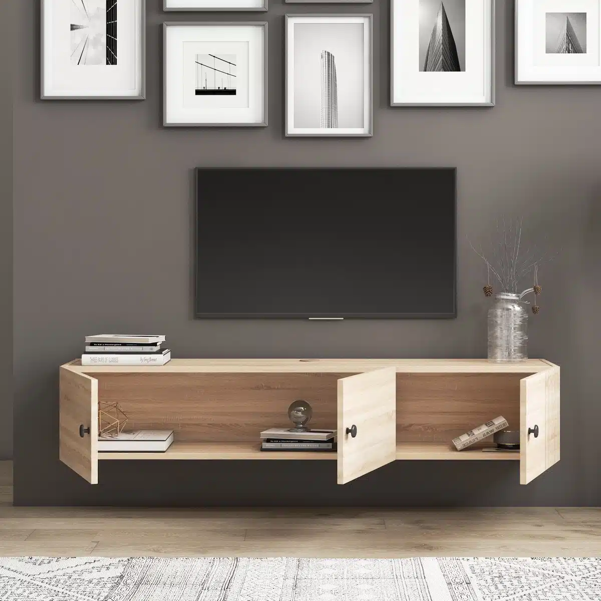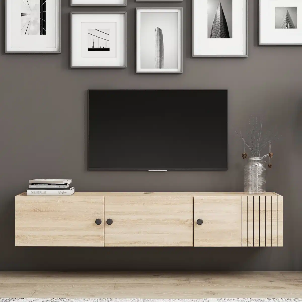 הוסיפו טאץ' מודרני ועכשווי לסלון שלכם עם מזנון הטלוויזיה הצף המזנון עשוי מעץ מתועש בגימור עץ אלון איכותי ובעל שלוש דלתות עם ידיות מתכת אלגנטיות. . המזנון בעל חור יעודי להשחלת הכבלים, קל להרכבה ומהווה תוספת מושלמת לכל מי שמחפש מזנון צף בעיצוב קלאסי בגימור עץ.