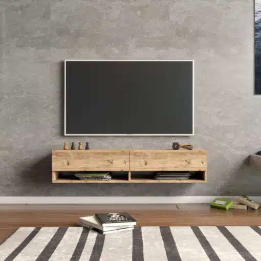 מזנון צף רוחב 140 ס"מ עם קלאפת אחסון כפולה ומדף נוסף לאחסון , עשויה משבבית דחוסה עם חיפוי מלמין איכותי עמיד יצוק.