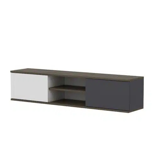 מזנון צף 160 ס"מ רוחב עם שני קלאפות אחסון גדולות מחולקות למדפים ושני מדפים אמצעיים פתוחים לאחסון.