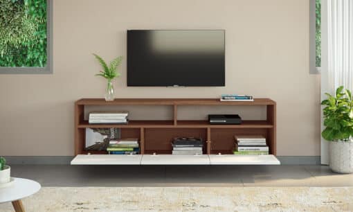 המזנון עשוי מעץ מתועש עם חיפוי מלמין יצוק בגימור מושלם ותו לקן מחמיר , בעל שלושה תאי אחסון ושני מדפים גדולים לאחסון רב תכליתי ולשמירה על מראה נקי ומסודר בסלון ופתח אחורי להשחלת הכבלים