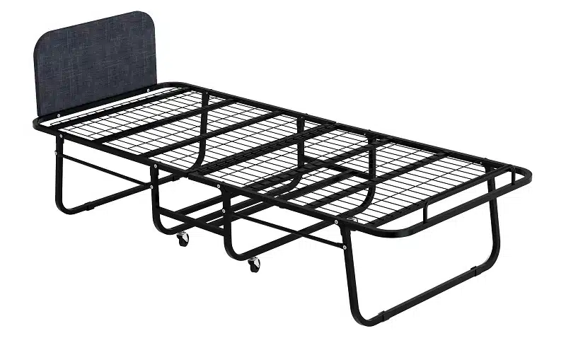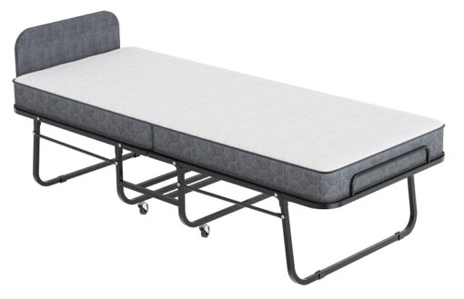 מיטת יחיד מתקפלת ניידת על גלגלים מגיעה עם מזרון אורטופדי מותאם ומתקפל לאחסון ושליפה קלה . המיטה עשויה ממתכת אל חלד חזקה ויציבה בצביעה אלקטרוסטטית בצבע שחור . מוצר אידאלי לאירוח בבית , בבתי מלון או בצימרים.
