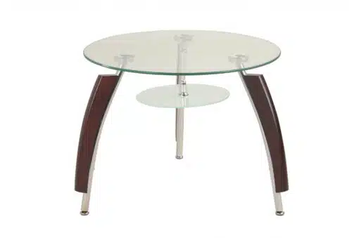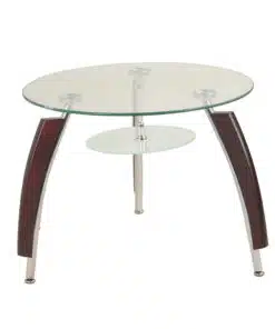 שולחן סלון זכוכית משולב עם מסגרת כרום ניקל וגימור עץ בצבע וואנגה. פלטות השולחן עשויות מזכוכית מחוסמת , הפלטה העליונה מזכוכית שקופה והפלטה התחתונה מזכוכית חלבית . השולחן מעוצב בסגנון מודרני וקל לניקוי ותחזוקה.