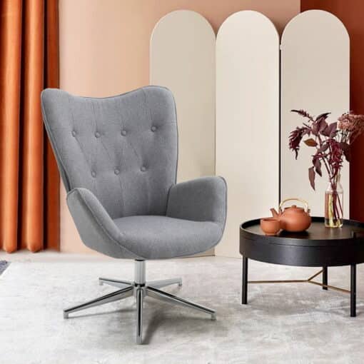 כורסא לסלון בצבע אפור מרופדת היטב בבד אריג איכותי עמיד וקל לניקוי, מסגרת הכורסא חזקה ויציבה עם בסיס מתכת בציפוי כרום ניקל , הכורסא מרופדת בספוג איכותי בצפיפות גובה ומערכת קפיצים איכותית המבטיחה עמידות ונוחות גם בישיבה ממושכת.
