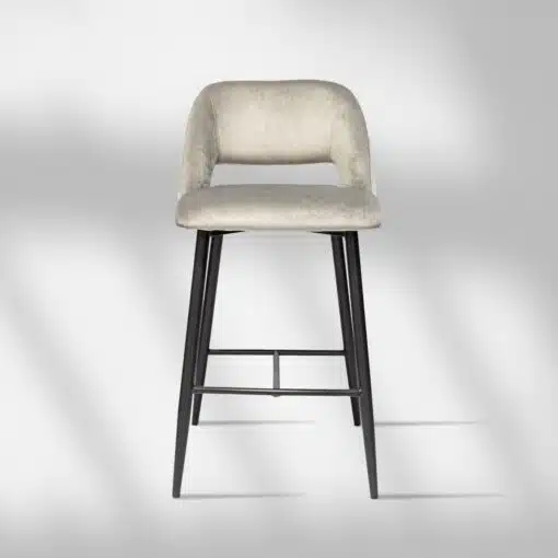 כסאות בר מבד קטיפה בצבע אפור בהיר עם משענת גב עגלגלה, כיסאות הבר האלו מרופדים היטב בספוג איכותי ובד קטיפה משובח עמיד ורך למגע.