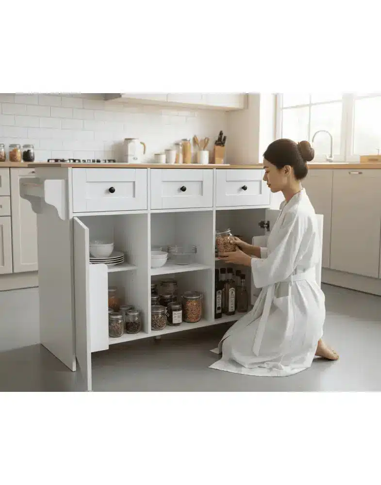 אי למטבח לבן מציע עיצוב נקי ומודרני לצד פונקציונליות גבוהה המתאימה לכל חלל. האי כולל משטח עבודה עמיד לשריטות המיועד לשימוש יומיומי אינטנסיבי ותחזוקה קלה.