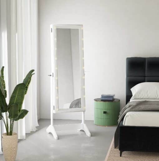 מראה עומדת באורך מלא ניתנת לפתיחה וחושפת ארון תכשיטים מרווח ומואר. מסגרת המראה מוקפת נורות לד הנדלקות באמצעות 3 סוללות אצבע (AA), ומאפשרות לכם להתאפר או להתגנדר בתאורה מושלמת.