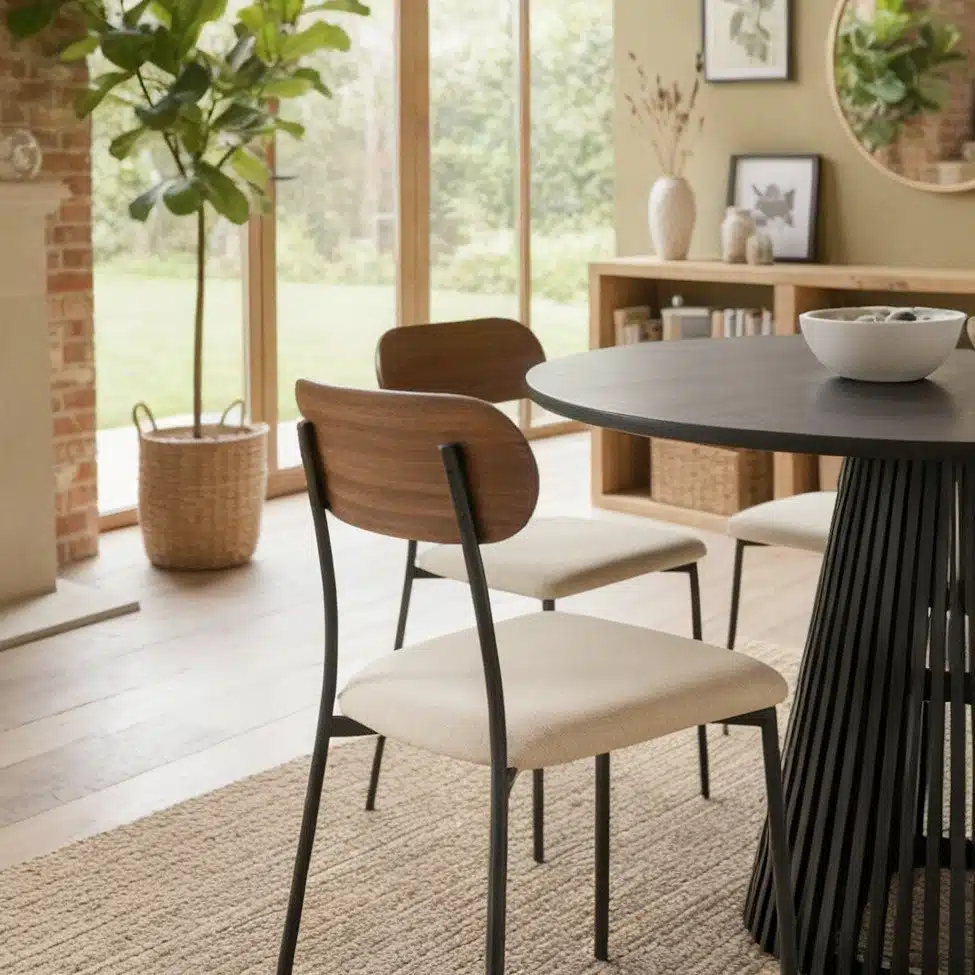 ✓ עיצוב סקנדינבי מודרני – גב אובלי בגוון אגוז חם בשילוב רגלי מתכת מושחרות יוצרים מראה יוקרתי ועכשווי שמשדרג כל פינת אוכל