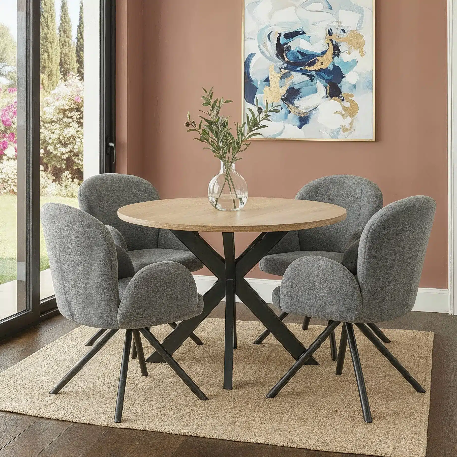 - שטיח מתחת: הניחו שטיח קצר-שיער מתחת לפינת האוכל כדי להגן על הרצפה ממנגנון הסיבוב ולהוסיף נגיעה עיצובית