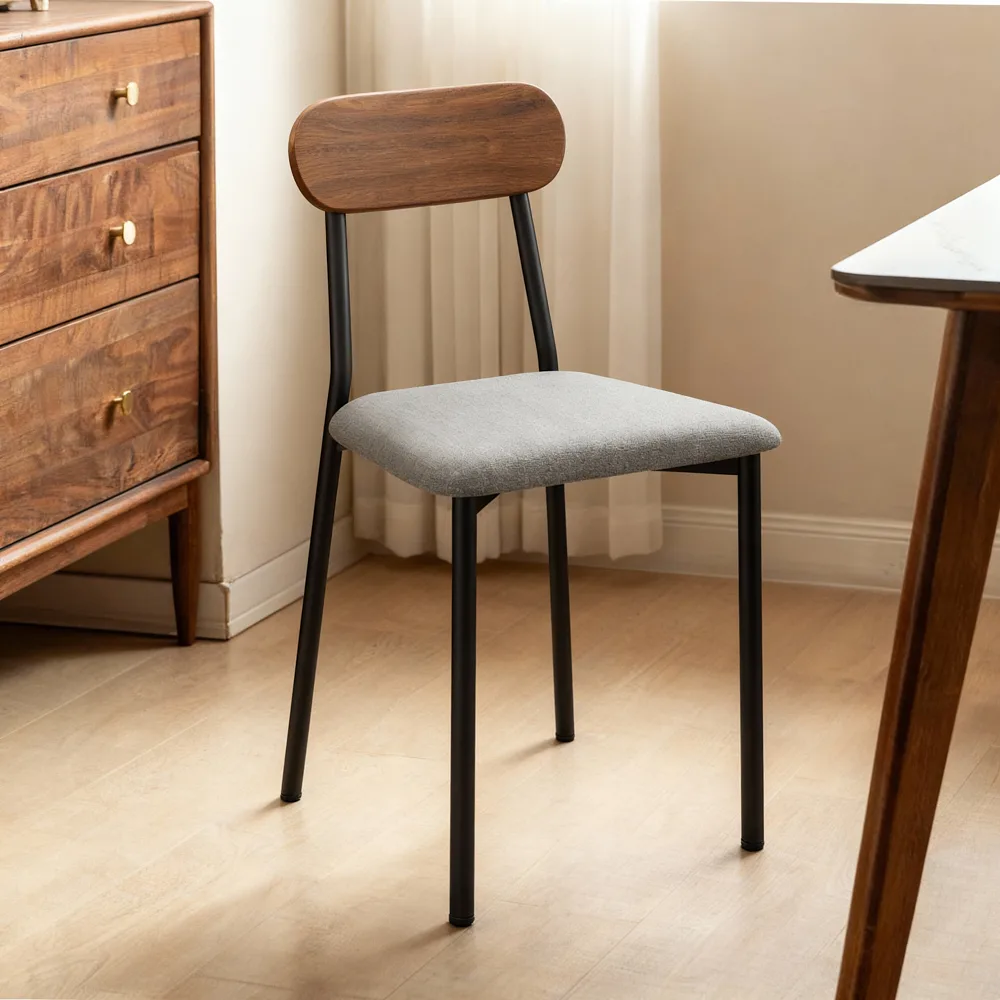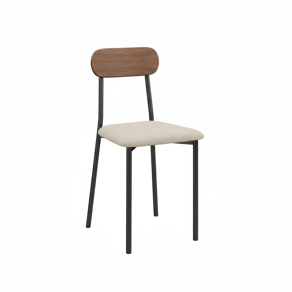 הכיסא המרופד עשוי מחומרים איכותיים ועמידים: ריפוד בד סינטטי רך וקל לניקוי, ספוג איכותי במושב, וגב בגוון אגוז יוקרתי עם רגלי מתכת מושחרות חזקות. הבד הסינטטי עמיד במיוחד לשימוש יומיומי ולבלאי, וקל מאוד לתחזוקה – מספיקה מטלית לחה כדי להסיר כתמים או לכלוך. רגלי המתכת מבטיחות יציבות ועמידות לאורך שנים, והן מתאימות לרצפות שונות ללא סיכון לשריטות.