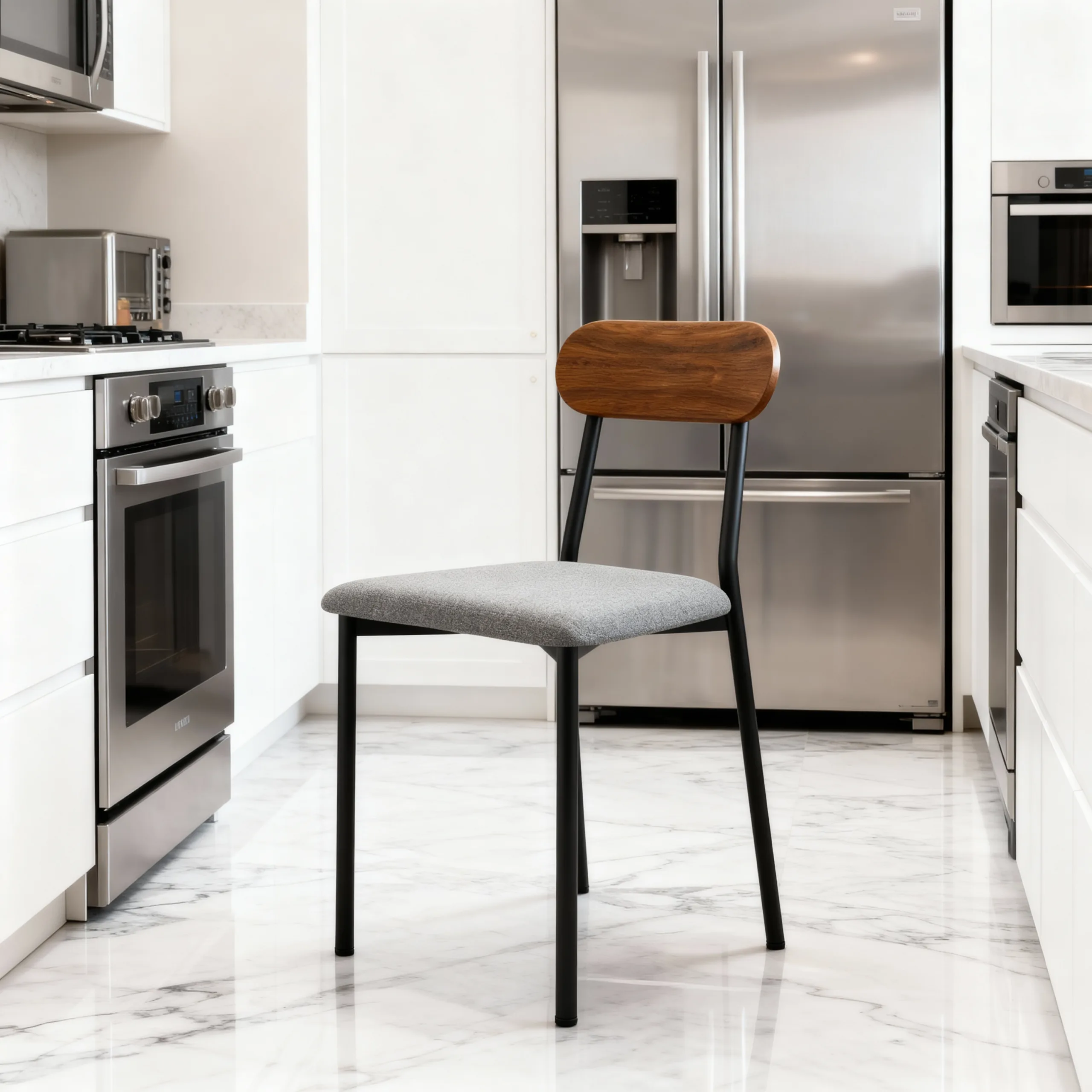 העיצוב המודרני והנקי של הכיסא המרופד לפינת אוכל בעל הגב בגוון אגוז יוקרתי מעניק תחושה של יוקרה ואלגנטיות המשתלבות בכל סגנון עיצובי. רגלי המתכת המושחרות מספקות יציבות מרבית וחוזק, והן יוצרות ניגוד אסתטי מושלם למושב המרופד. העיצוב הממוסגר והמאוזן הופך את הכיסא לפריט רב-תכליתי שמתאים לפינת אוכל קלאסית או מודרנית, ומשלב אלגנטיות עם פונקציונליות בצורה מושלמת.