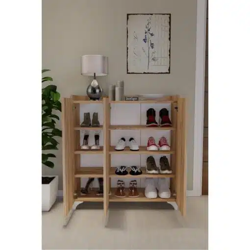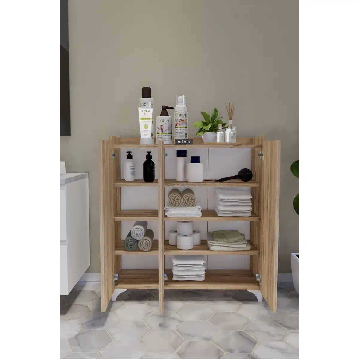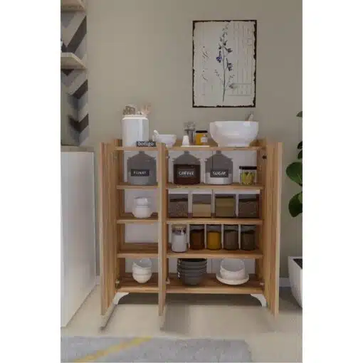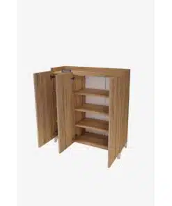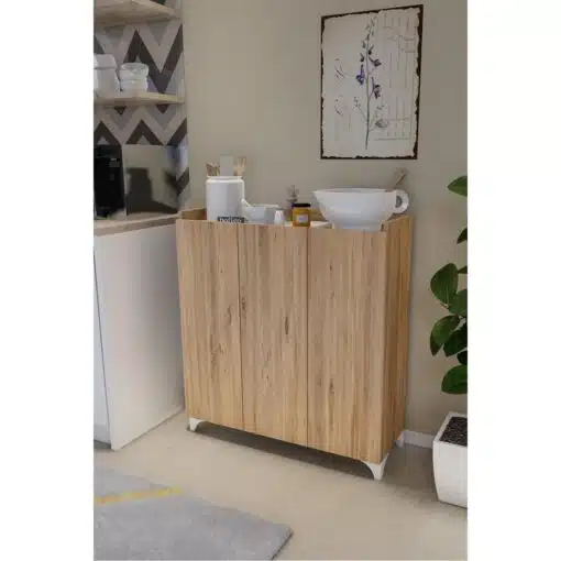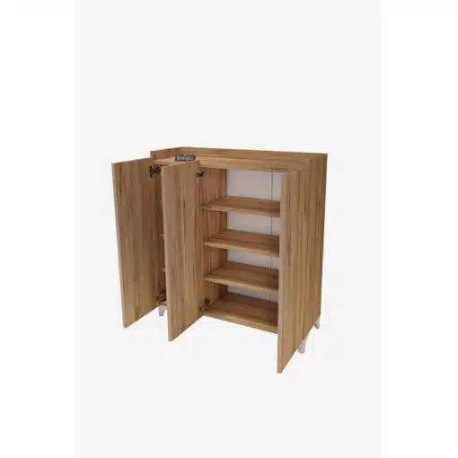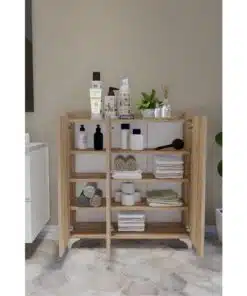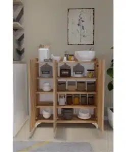 ארונית מדפים למטבח או לחדר האמבטיה . הארון עשוי מעץ מתועש עם חיפוי מלמין יצוק בגוון עץ.