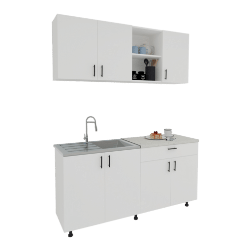 הכירו את המטבח הלבן המודרני, פתרון מושלם לחללים קטנים, המשלב עיצוב נקי ופונקציונליות מרבית. המטבח כולל ארונות עליונים ותחתונים מרווחים, משטח עבודה פרקטי וכיור נירוסטה (לא כלול בתמונה), ויוסיף נופך של סטייל לכל בית.