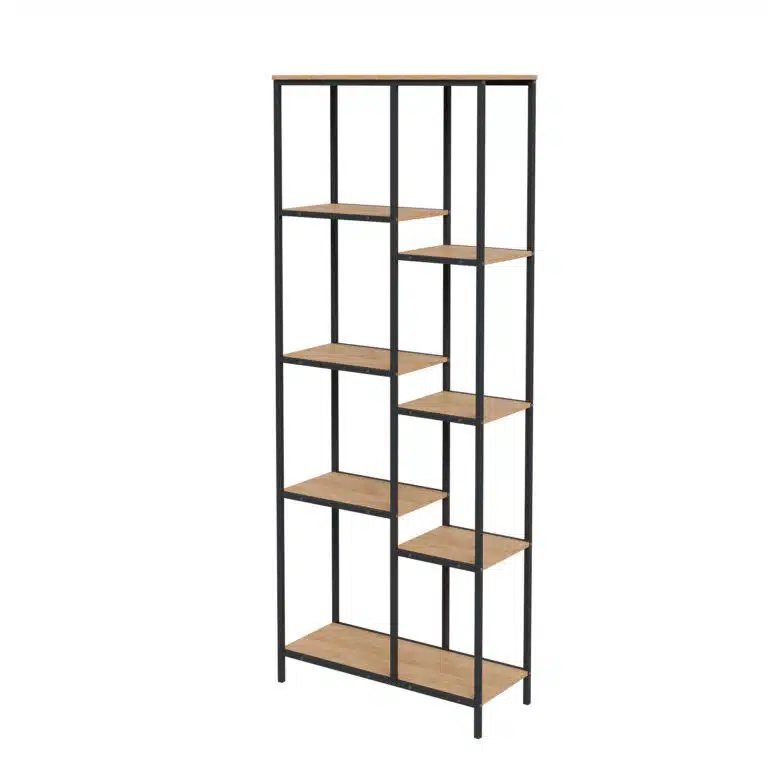העיצוב המודרני והנקי של כוננית הספרים המדורגת משלב מסגרת מתכת חזקה עם מדפי MDF רחבים ונוחים. הקווים הישרים והגיאומטריים של המסגרת יוצרים מראה תעשייתי-מודרני המוסיף אופי ועומק לכל חלל. סידור המדפים המדורג – כאשר המדפים ממוקמים לסירוגין משני צידי המסגרת – מקנה לכוננית מראה דינמי וייחודי המבדיל אותה מכוניות ספרים קונבנציונליות.