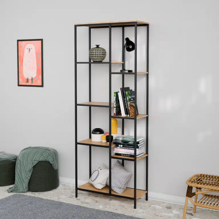 - מדפי אלון עם מתכת מושחרת – שילוב של חום עץ בהיר ומסגרת שחורה, לסגנון סקנדינבי-מודרני חם ומזמין