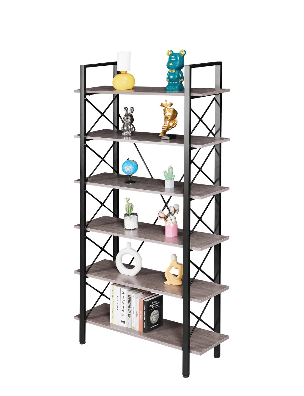 מבנה יציב: 6 מדפים רחבים בעובי 18 מ"מ עם שלדת מתכת חזקה ועיצוב × לייצוב מקסימלי. גב פתוח למראה אוורירי ותחושת מרחב.