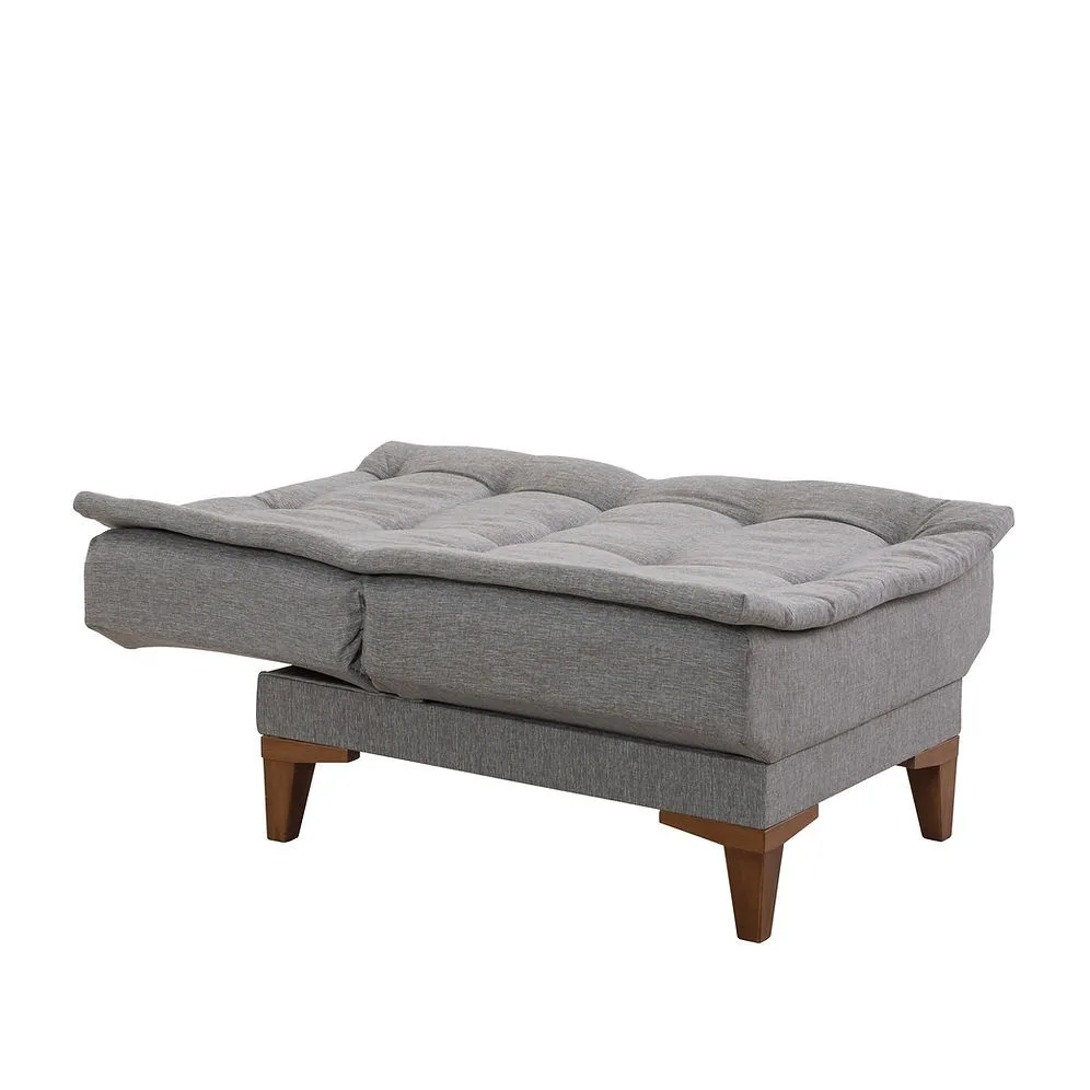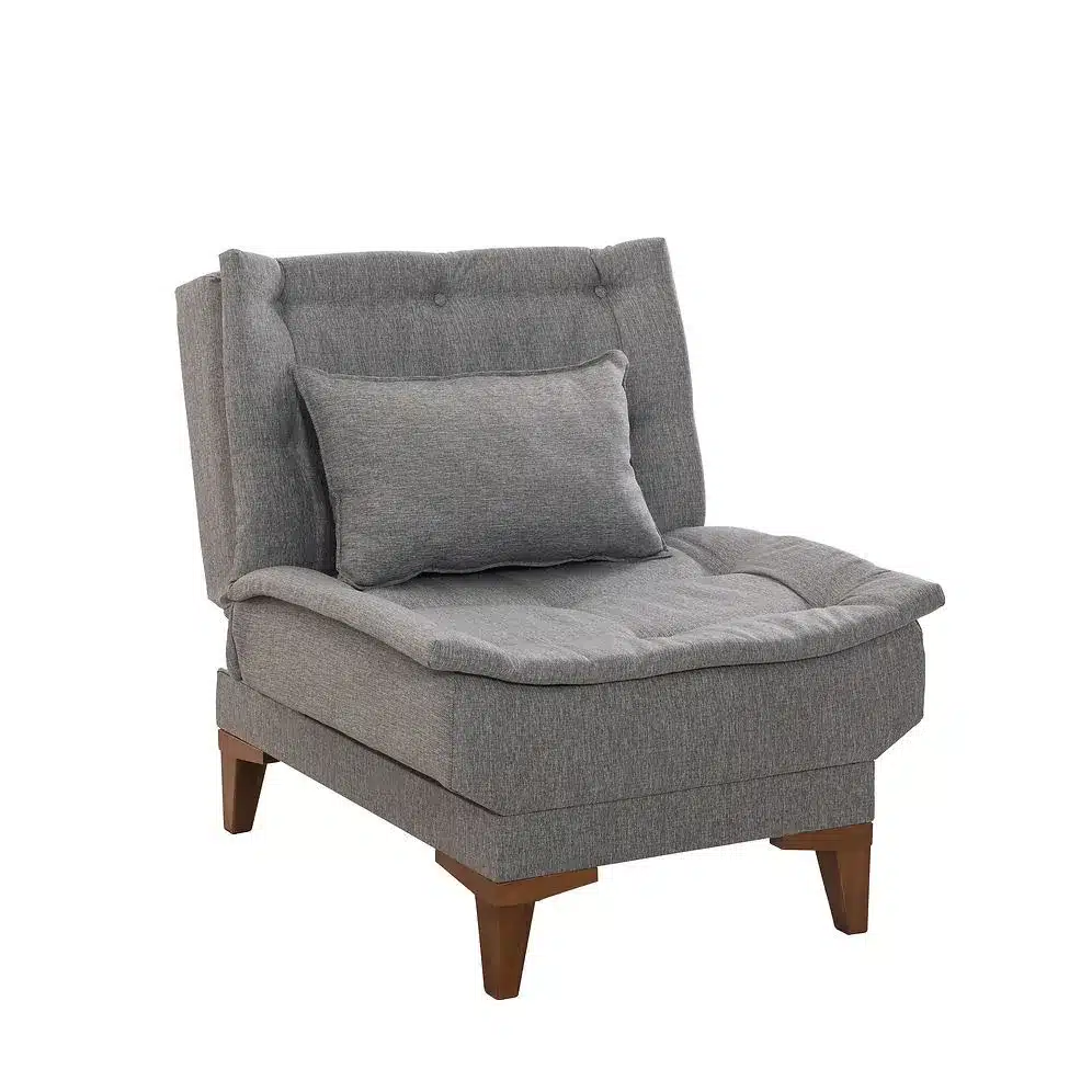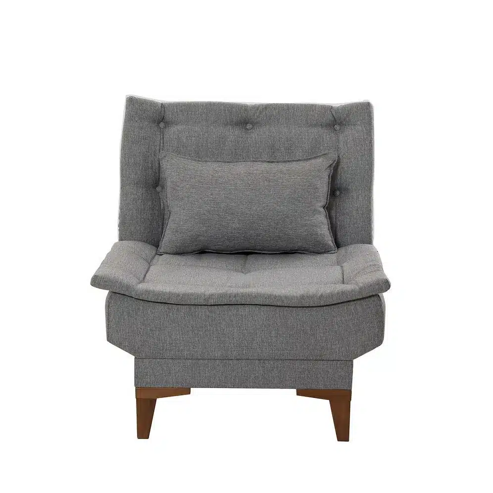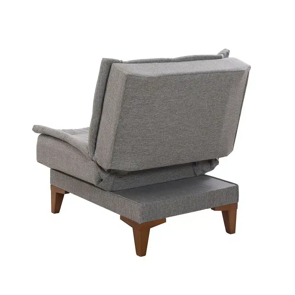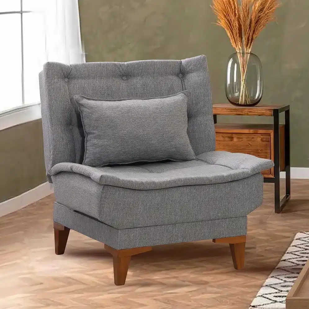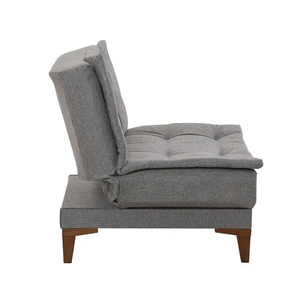 העיצוב המודרני והנקי של הכורסא הנפתחת מתאפיין בקווים אלגנטיים ובגימור מוקפד. הגב המרופד מעוטר בכפתורים דקורטיביים המעניקים לכורסא מראה יוקרתי ומעודן. מסגרת העץ היציבה מבטיחה יציבות מקסימלית, והריפוד עשוי בד פוליראטן רך ונעים למגע בגוון אפור עכשווי שמתאים לכל סגנון עיצוב פנים. השילוב של אלגנטיות ופונקציונליות הופך את הכורסא לפריט מרכזי בכל חלל.
