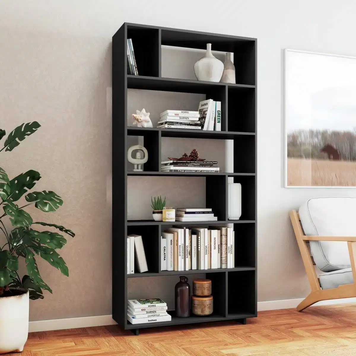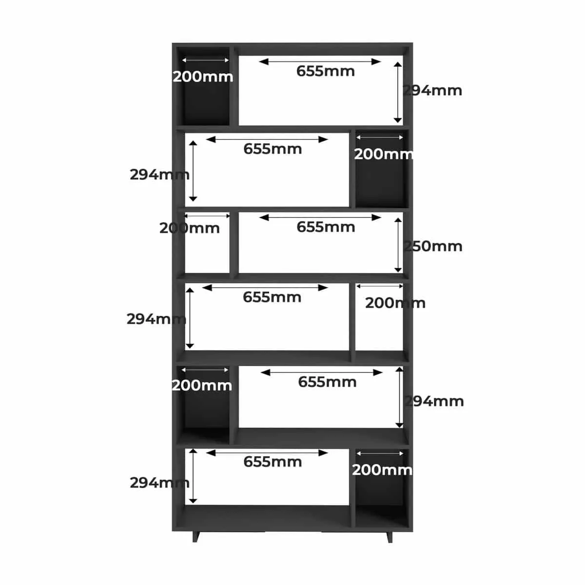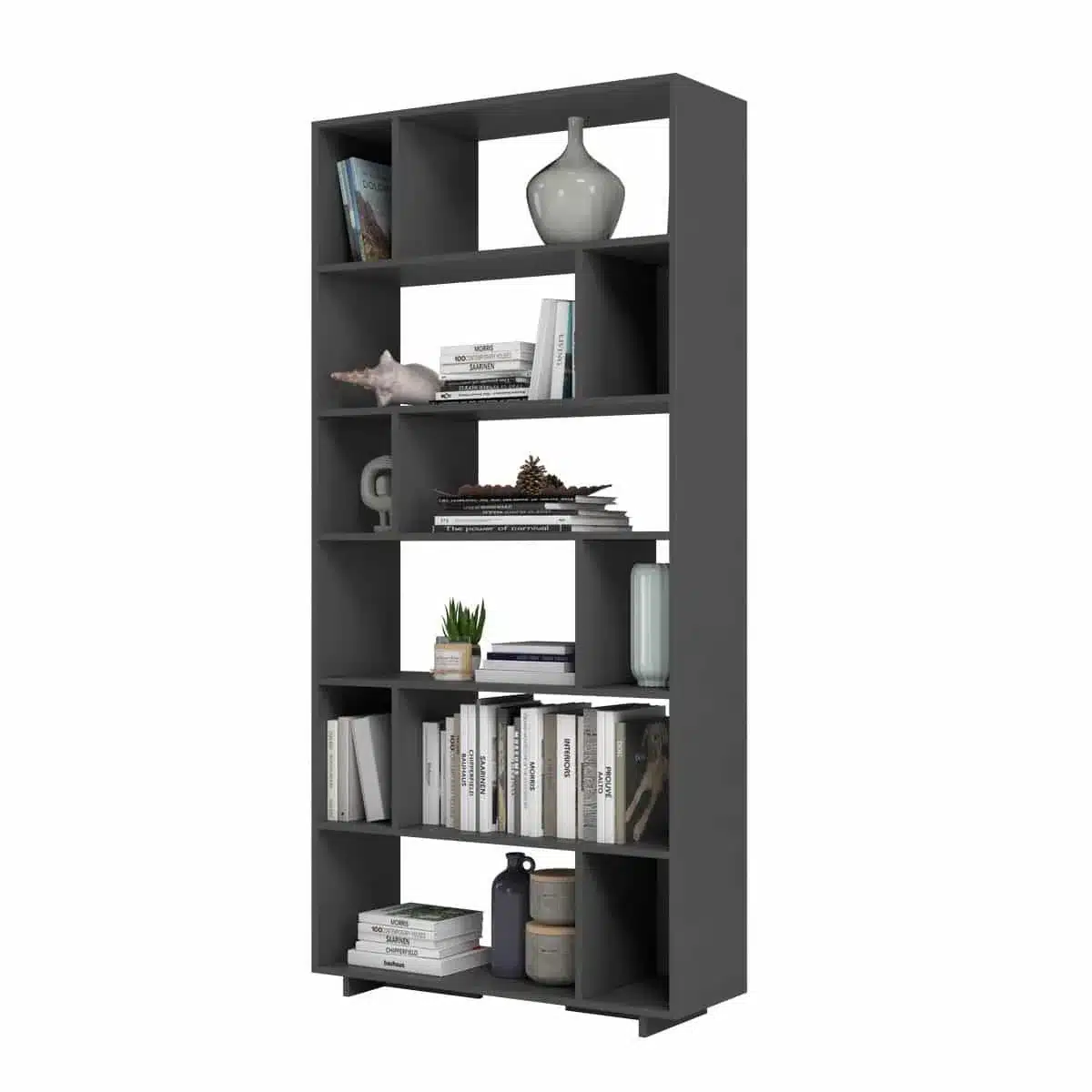 ארון ספרים מעוצב לסלון אלגנטי בעיצוב LOFT המציע פתרון אחסון חכם ומגוון עם 12 תאי אחסון מרווחים הפרוסים על פני 6 מדפים. העיצוב הגיאומטרי הייחודי והמבנה הגבוה והצר הופכים אותו לתוספת מושלמת לכל חלל בבית או במשרד.