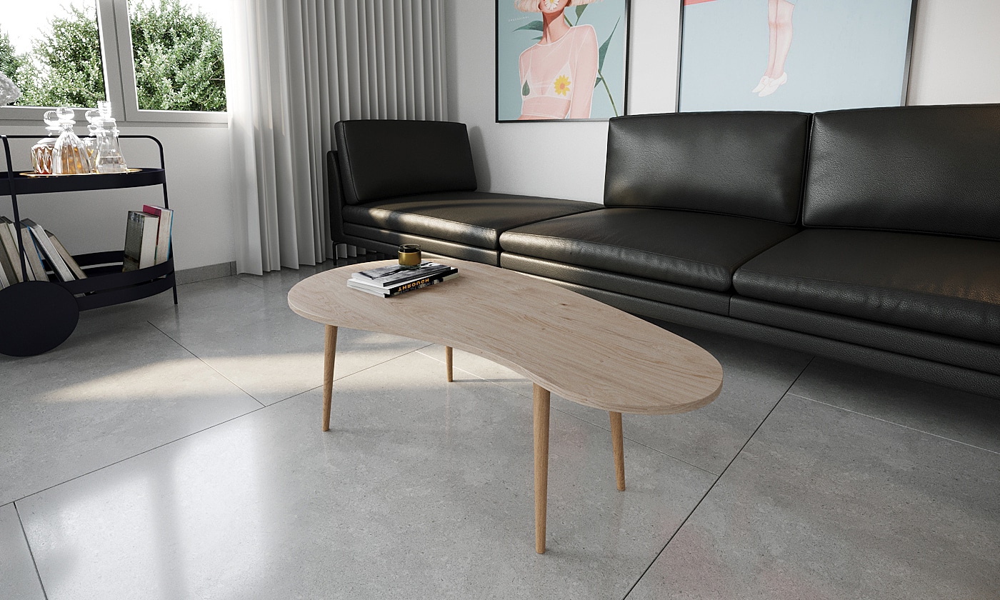 שולחן סלון בצורת אליפסה בגוון עץ אלון עשוי מעץ מתועש עם חיפוי מלמין יצוק. רגלי השולחן עשויות עץ חזקות ויציבות