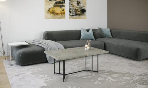 שולחן סלון בעיצוב נקי משולב מתכת אל חלד חזקה ויציבה ופלטת בגימור בטון עשויה מעץ מתועש עם חיפוי מלמין יצוק.