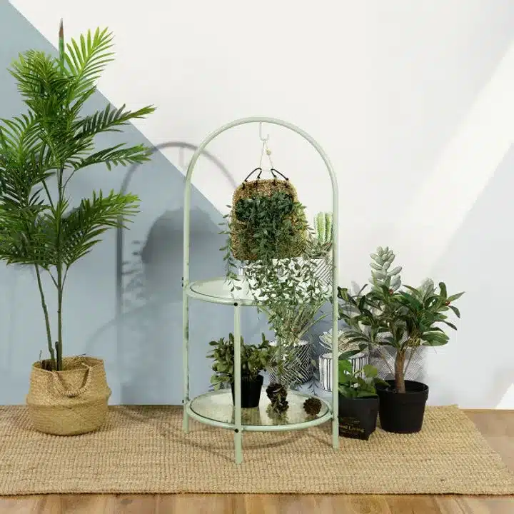 מעמד עציצים מעוצב עם מדפי זכוכית – עיצוב קשת ייחודי בסגנון מודרני