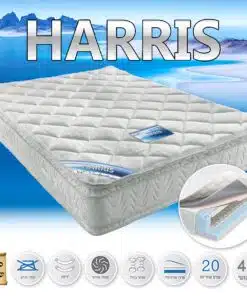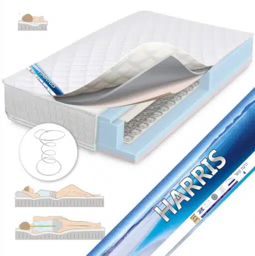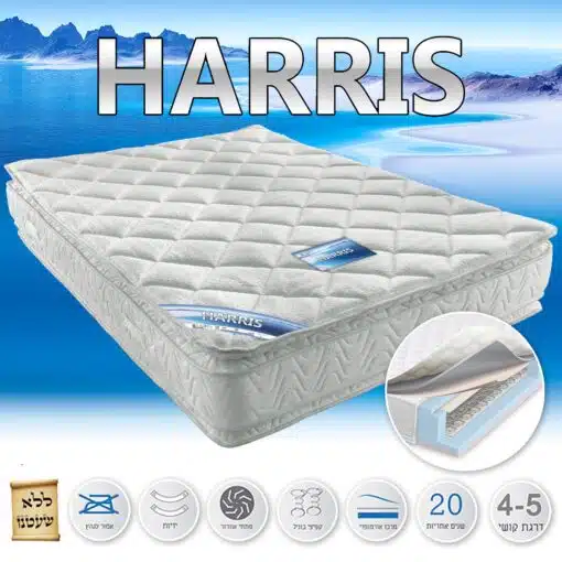 מזרון אורטופדי דגם הריס עם מערכת קפיצים איכותית . למזרון יש שני שכבות נוחות – פילו -טופ , המזרון מאובזר במערכת קפיצים איכותית עמידה המבטיחה לשמור תמיכה מעולה לגב ושינה ונעימה. המזרון מרופד מבד ז'קארד מיוחד דוחה אבק ובקטריה תפור בתפריה מיוחדת. למזרון 3 שכבות נוחות בדרגות קושי שונות , לחץ 33 .