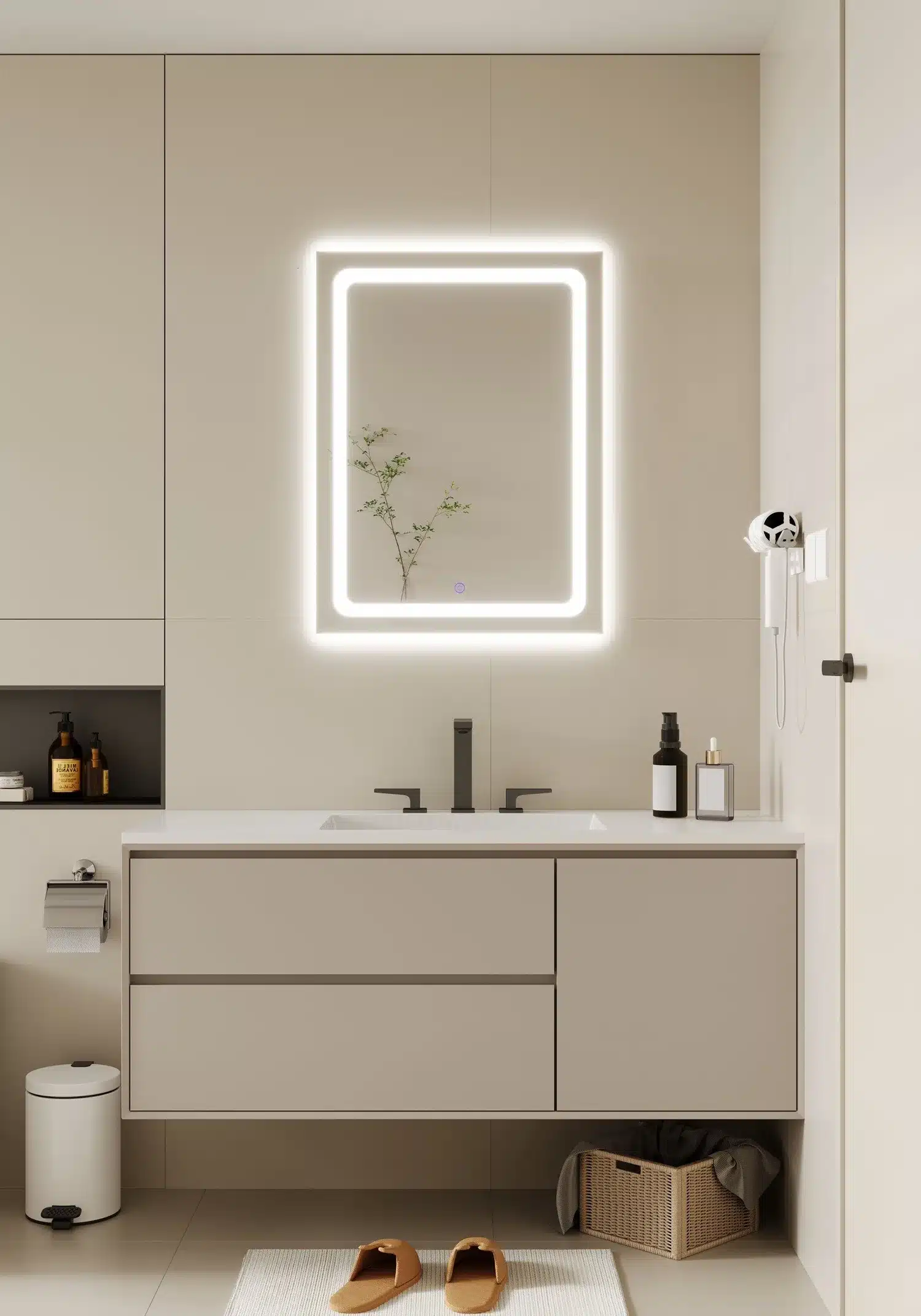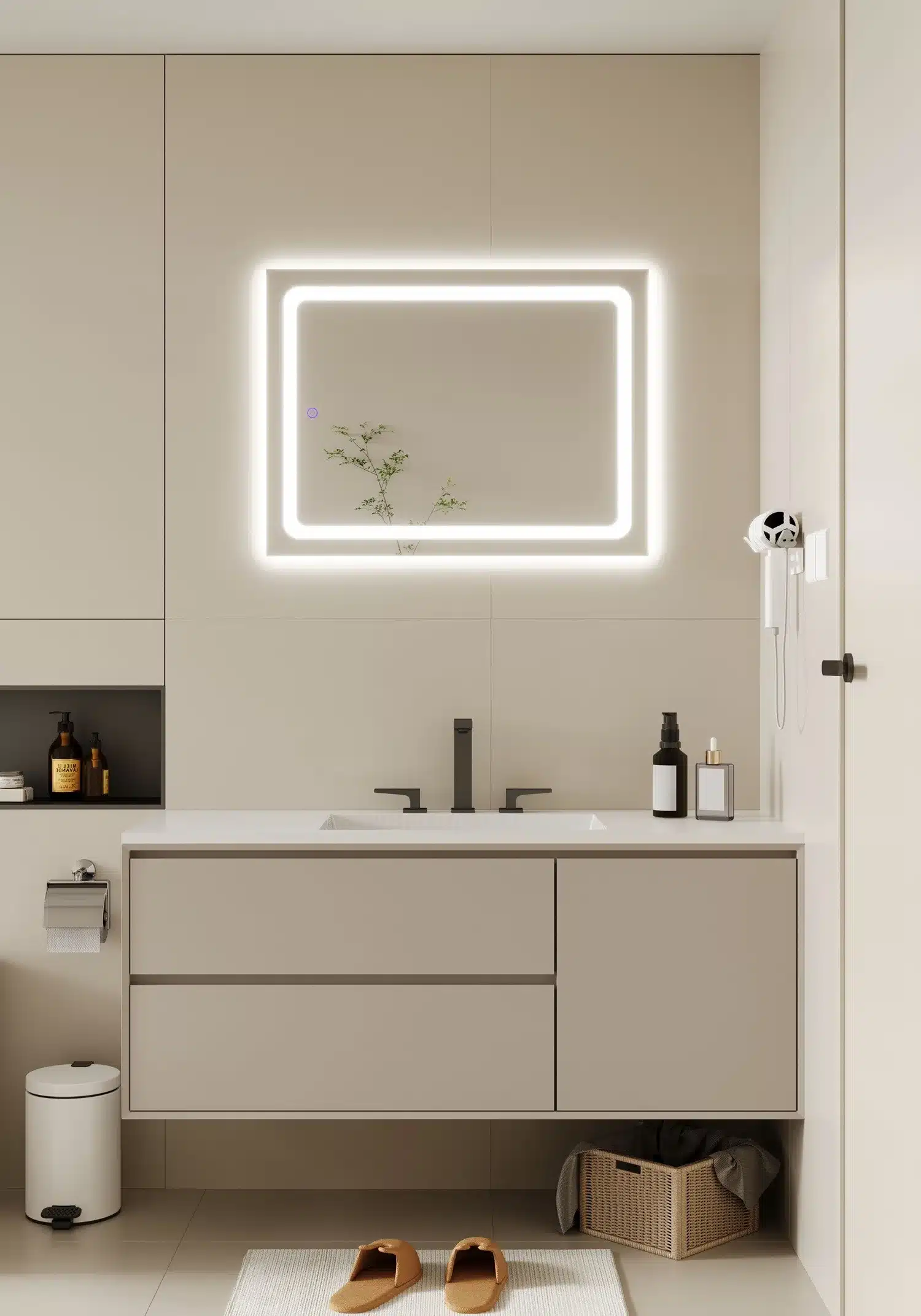 אחד היתרונות הבולטים והמרכזיים של מראה זו הוא המערכת החכמה של שני גווני תאורה מתכווננים. ניתן לבחור בקלות בין תאורה לבנה קרה שמספקת אור בהיר ומדויק לאיפור, גילוח והתארגנות בוקר מדויקת, לבין תאורה חמה ונעימה שיוצרת אווירה רגועה ורומנטית לערבים ולאמבטיות מפנקות. ההפעלה נעשית בקלות באמצעות מגע טאץ' פשוט וקל על פני המראה, ללא צורך בלחצנים מסורבלים או מתגים חיצוניים.