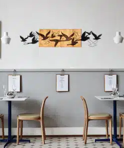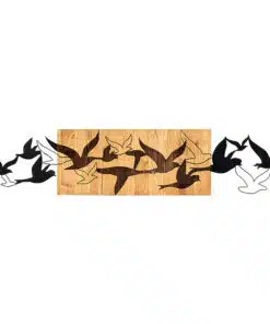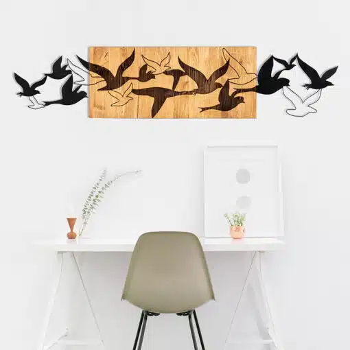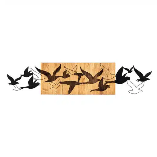 דקורציה לקיר נדידת ציפורים עשויה ממתכת שחורה בעובי 1.2 מ"מ ומסגרת עץ בעובי 3 ס"מ.