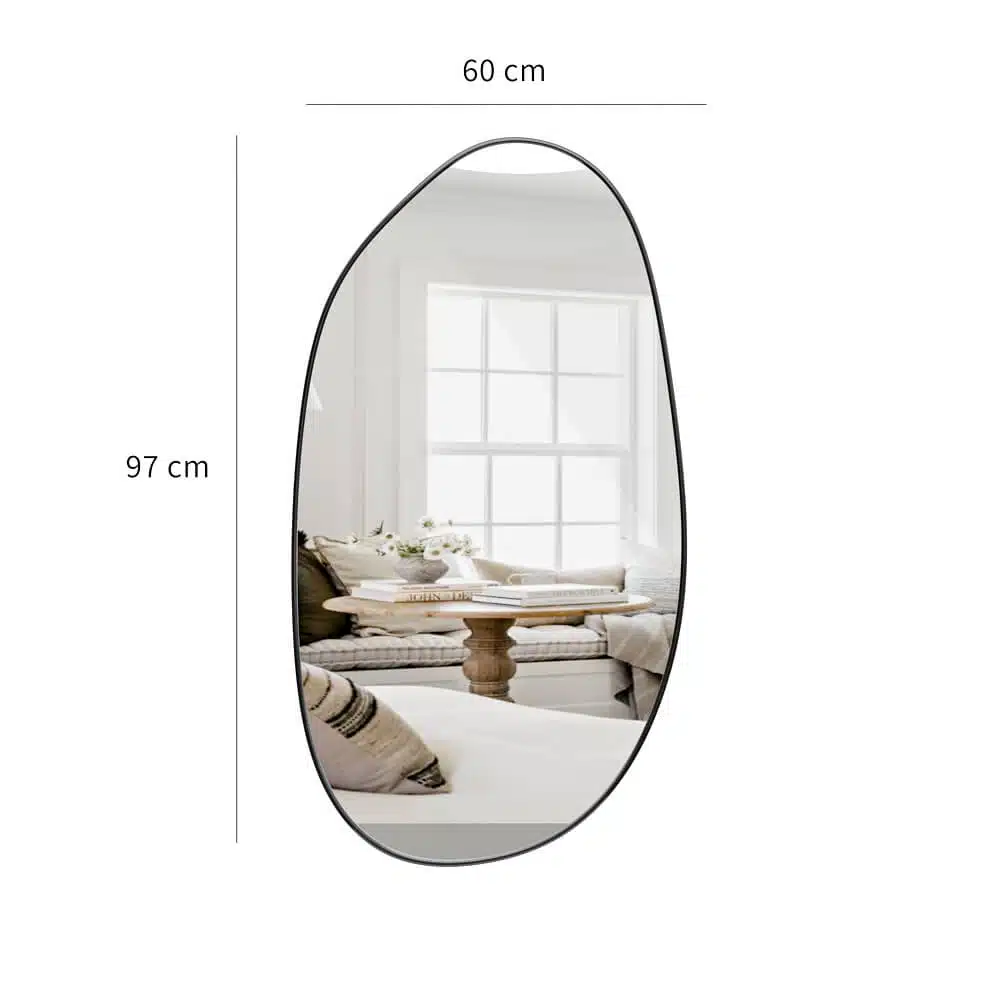 מראה מעוצבת בסגנון א-סימטרי מודרני – עיצוב אליפטי יוקרתי בגימור מתכת מושחרת