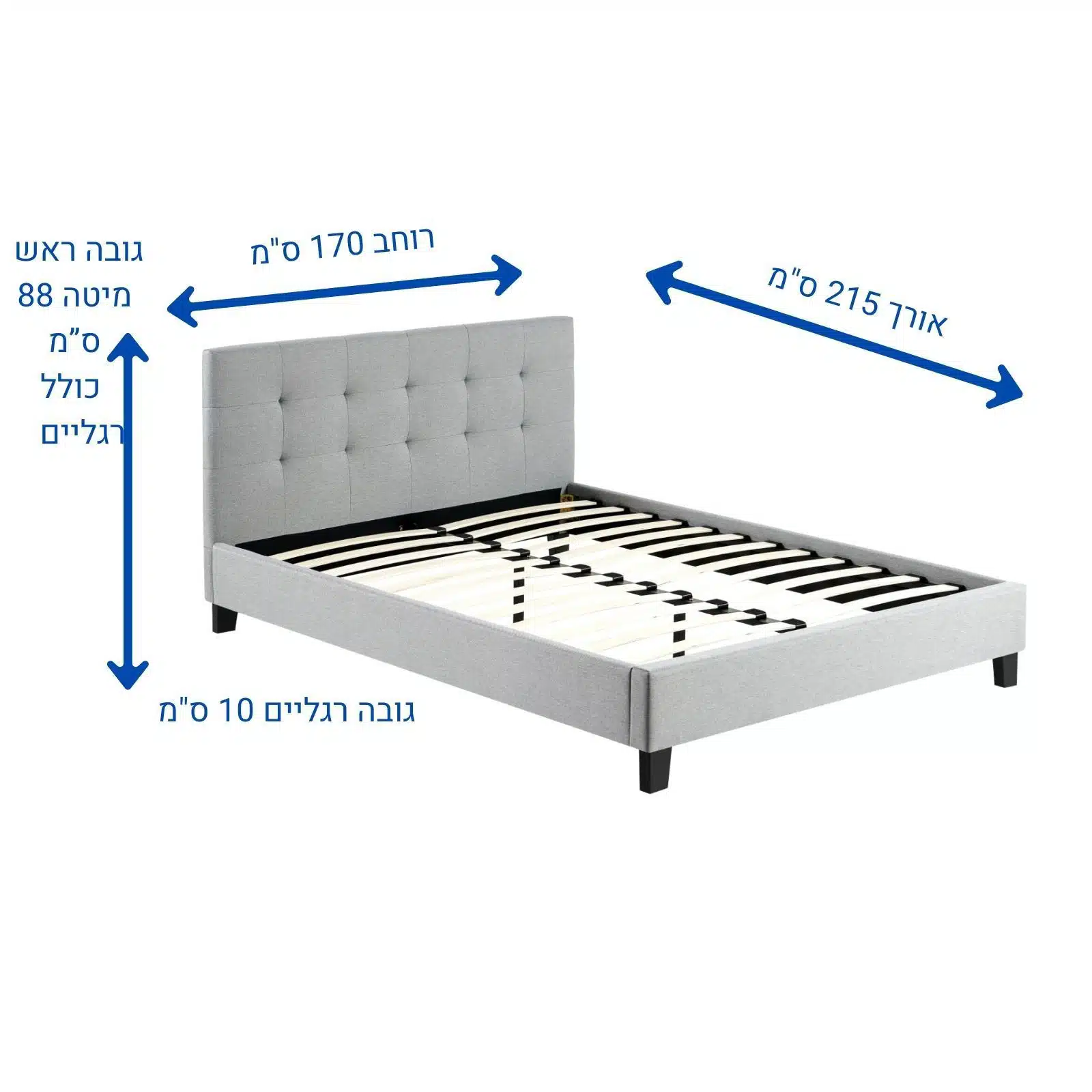 מידות: 215×170 ס"מ, גובה ראש מיטה 88 ס"מ.