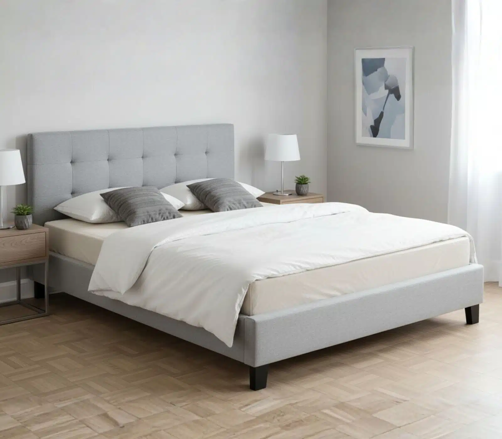 מיטה זוגית מרופדת בגוון אפור אלגנטי, המשלבת מראה יוקרתי עם פונקציונליות גבוהה. מתאימה למזרן 160×200 ס"מ ומשדרגת כל חדר שינה בסגנון נקי ומודרני.