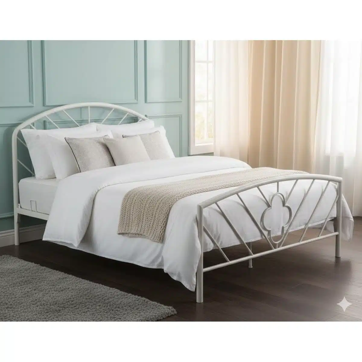 מיטת מתכת זוגית עם עיצוב גיאומטרי בצבע לבן נקי היא הבחירה המושלמת לחדר שינה מודרני. המיטה משלבת מבנה מתכתי חזק ועמיד עם עיצוב ייחודי ואלגנטי המתאים לכל סגנון עיצובי.