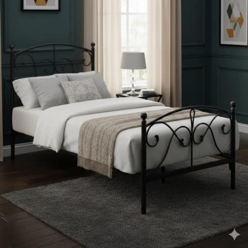 העיצוב הקלאסי והמרהיב של מיטת היחיד מתכת מעוצבת כולל משענת ראש גבוהה ומשענת רגליים עם עיטורים דקורטיביים בסגנון רומנטי – סלסולים אלגנטיים ועיצובי לבבות שמעניקים למיטה מראה ייחודי ומרשים. הגימור בצבע שחור מט יוצר מראה נקי ומודרני שמשתלב בקלות עם כל סגנון עיצוב פנים.