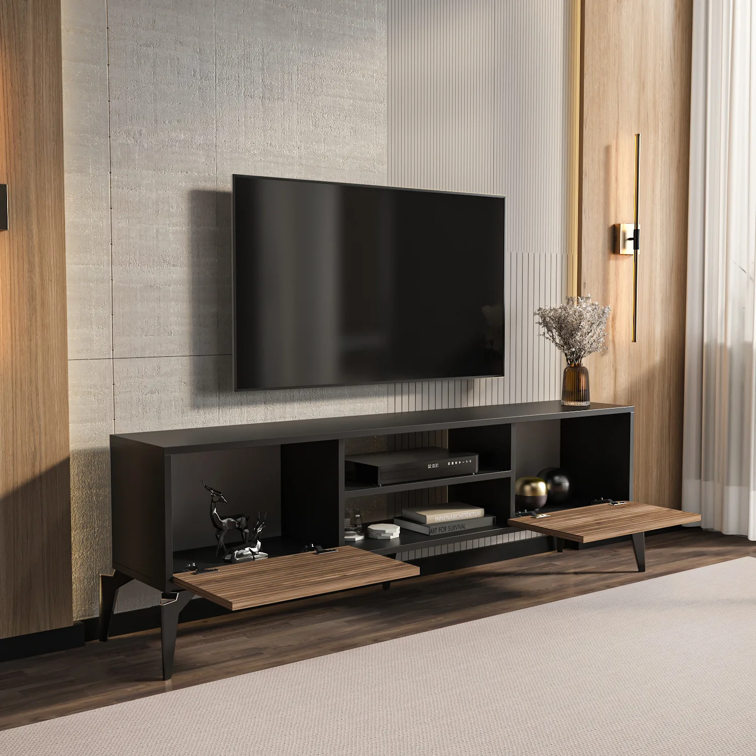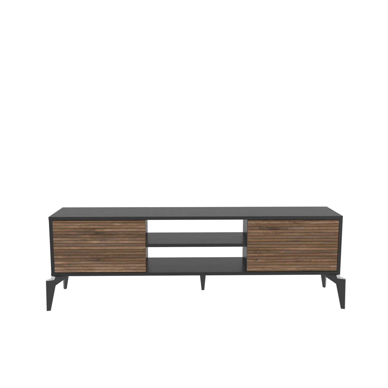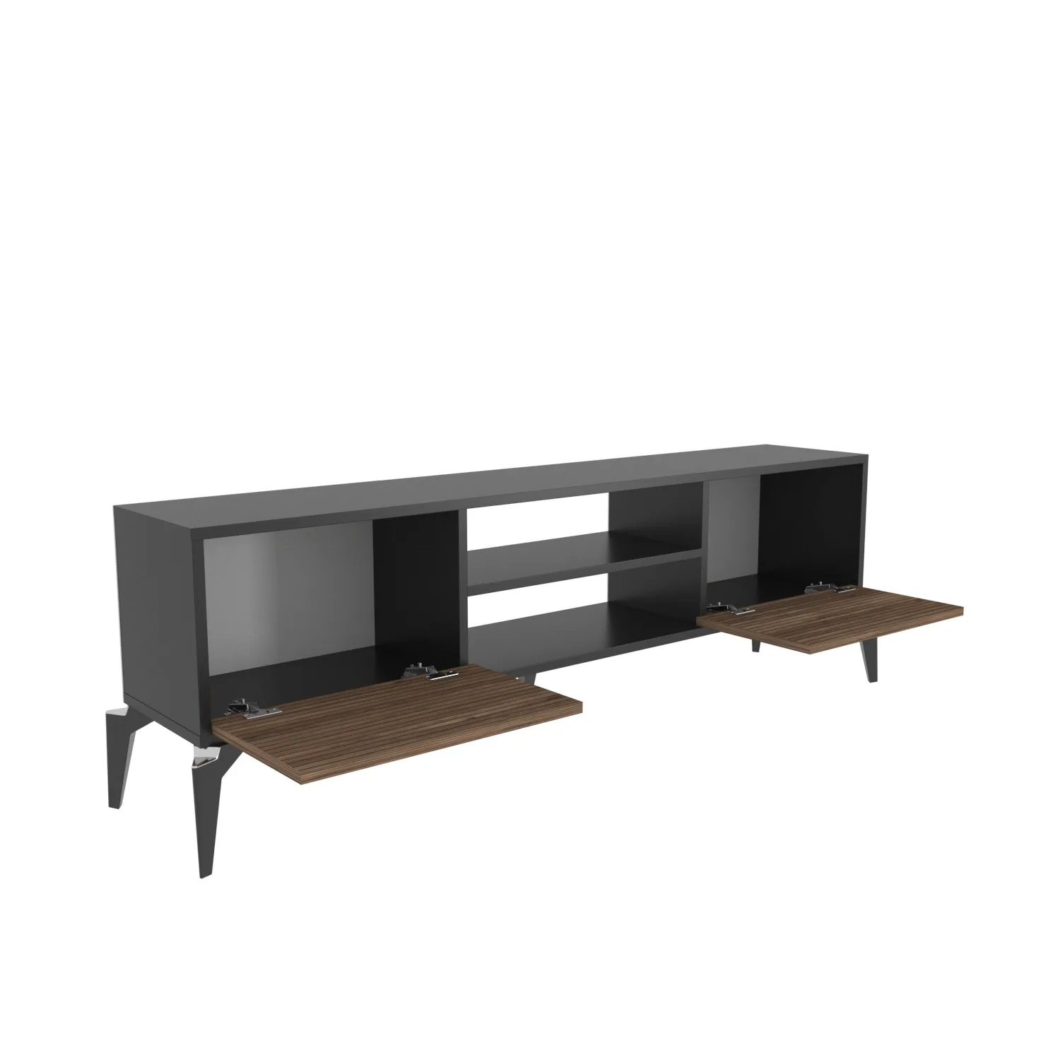 מזנון טלוויזיה מודרני לסלון בעיצוב חדשני המשלב גוף בצבע שחור עם דלתות בגוון אגוז טבעי. המזנון מושלם לסלונים מודרניים ולחדרי משפחה.