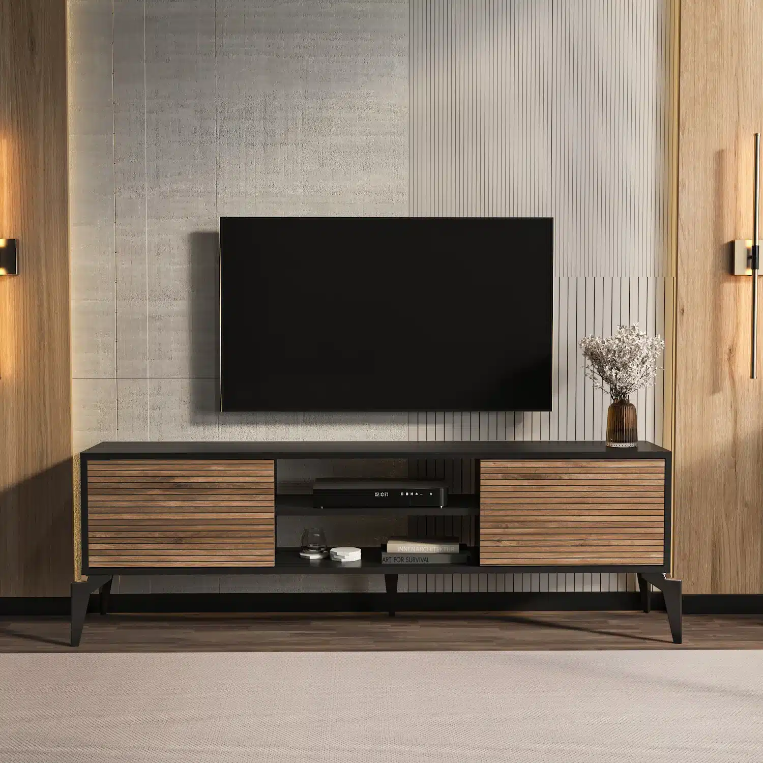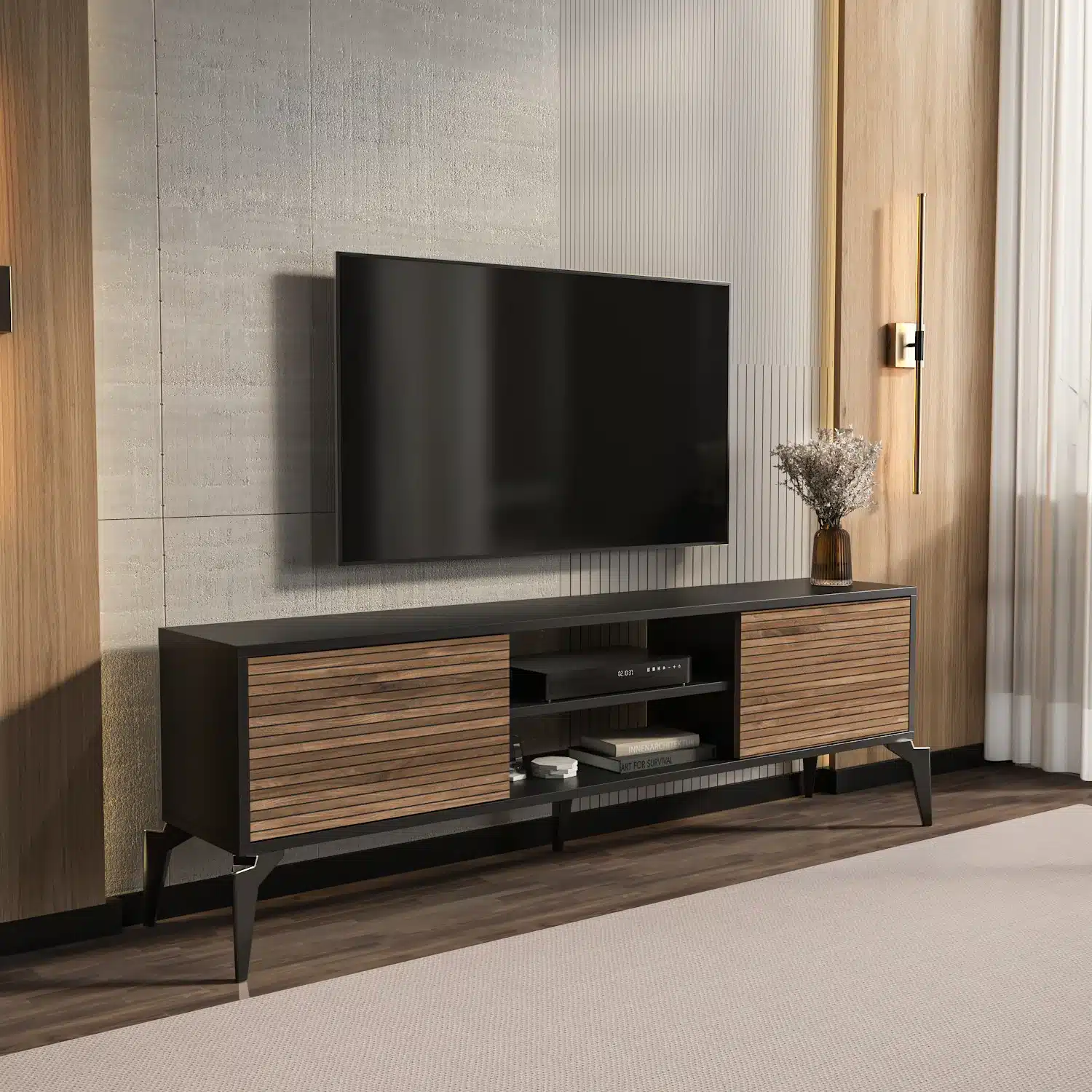 ✓ עיצוב מודרני ואלגנטי – שילוב צבעים ייחודי של שחור ואגוז עם דלתות בדוגמת פסים אופקיים, יוצר מראה יוקרתי שמשדרג כל סלון