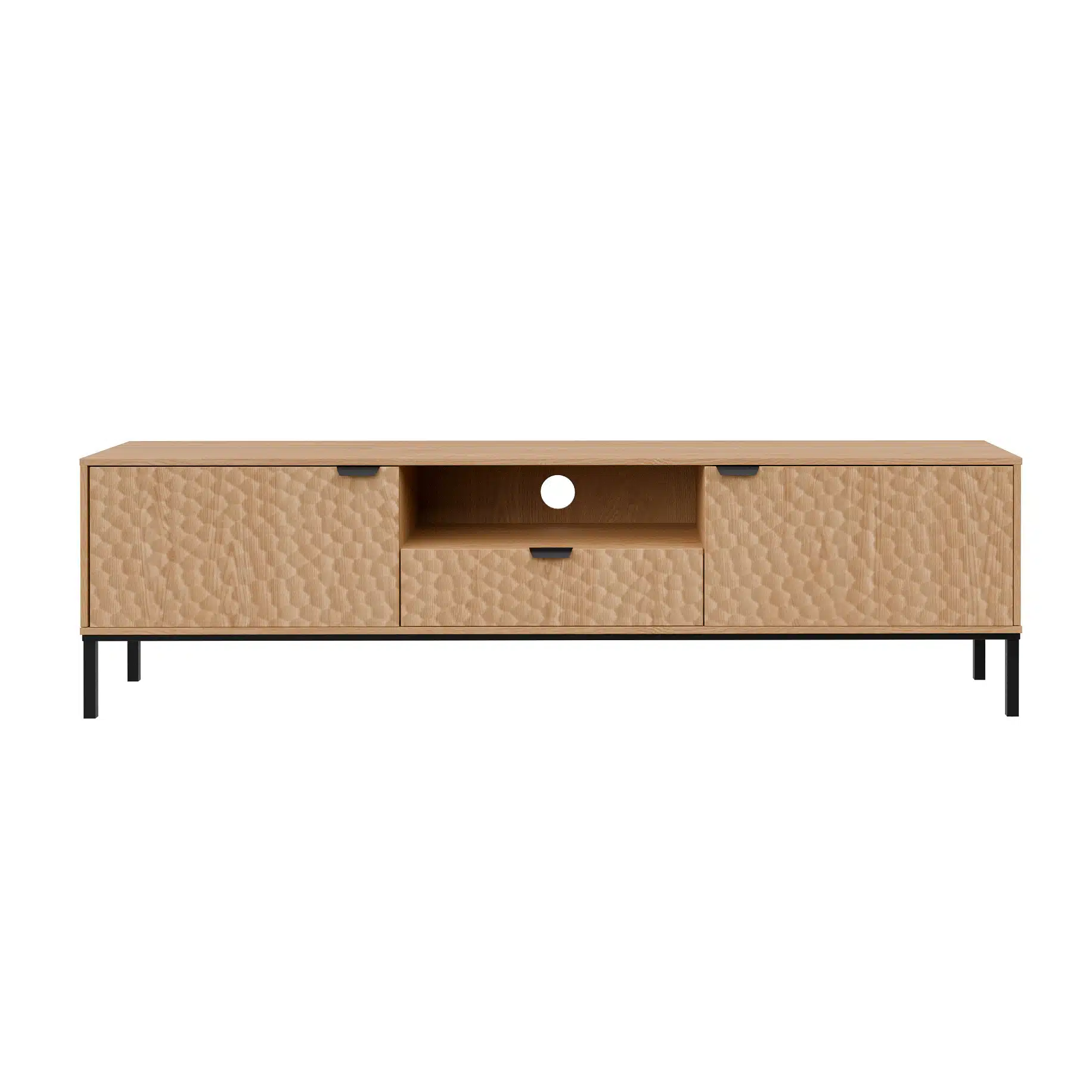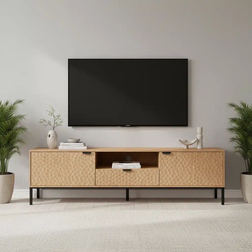 מזנון טלוויזיה אלגנטי המשלב עיצוב מודרני עם פונקציונליות מתקדמת. הדלתות מעוטרות בטקסטורה גיאומטרית תלת מימדית היוצרת משחק אור וצל מרהיב.