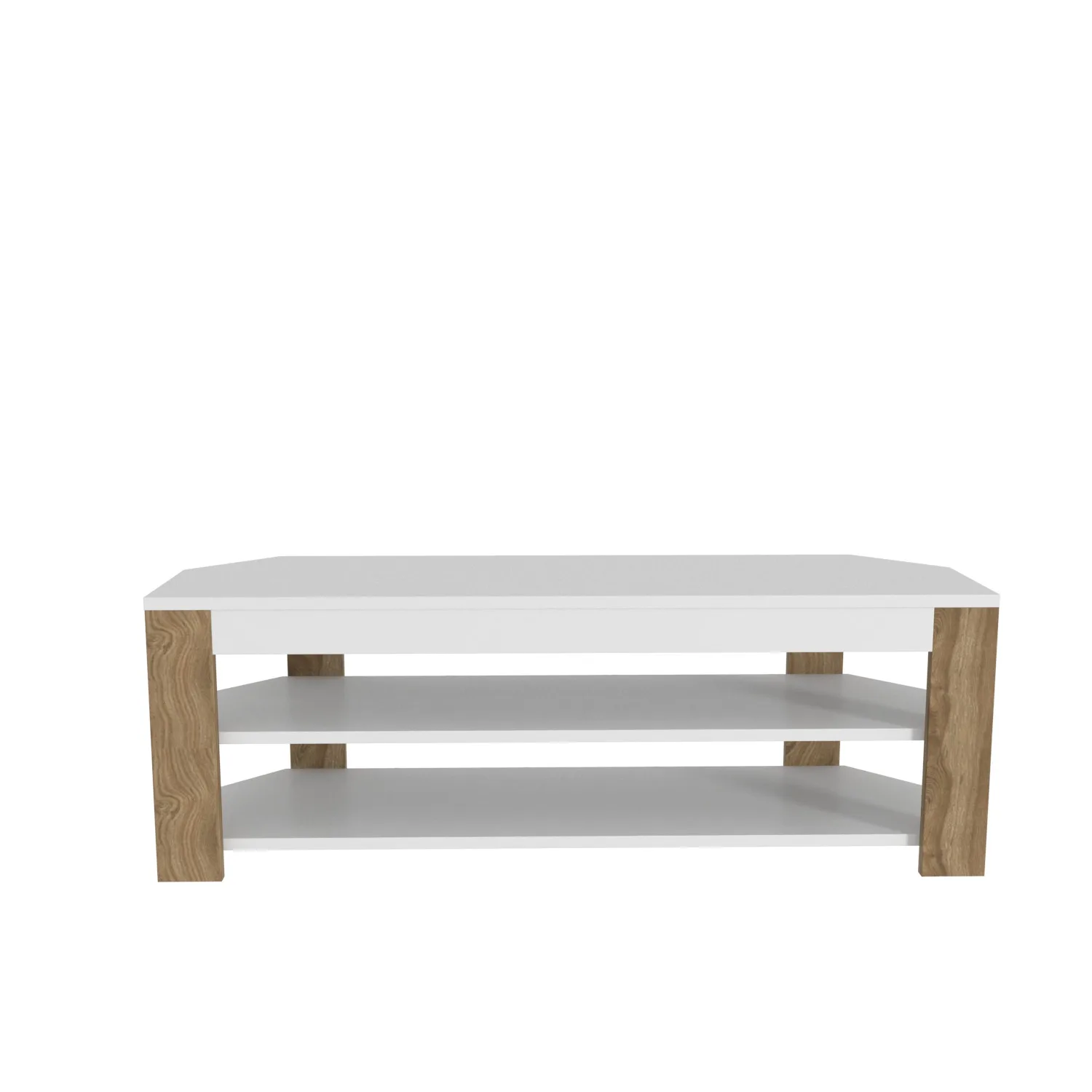 עיצוב ייחודי: שילוב מנצח של משטחים בגוון לבן עם רגליים בגוון עץ אגוז טבעי. 2 תאי אחסון פתוחים לציוד נלווה ופתרון נוח לכבלים.
