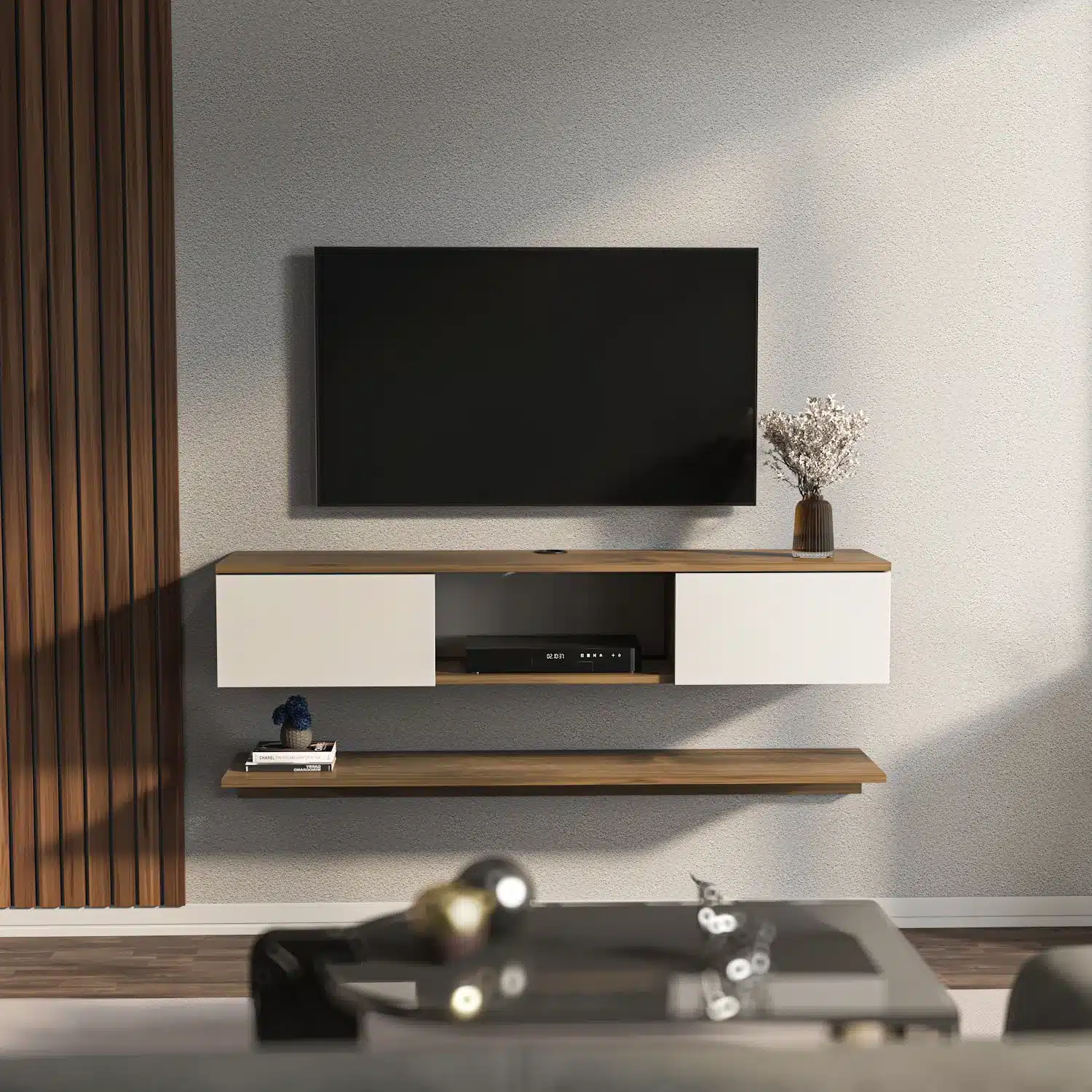 מזנון טלוויזיה צף עם מדף זמין בגוון אלגנטי המתאים לסגנונות עיצוב מגוונים:
