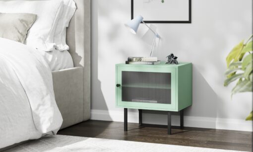 שידת לילה מודרנית בעיצוב עוצר נשימה בגוון טורקיז מנטה. השידה עשויה מעץ מתועש וציפוי מלמין איכותי, עם רגלי מתכת מושחרות. היא כוללת שני תאים פנימיים מרווחים המופרדים באמצעות מדף אמצעי, המספקים מקום רב לאחסון חפצים חיוניים ליד המיטה, כגון שעון מעורר, ספרים, טלפון או כל דבר אחר.