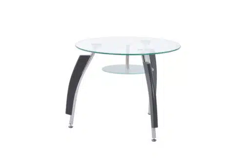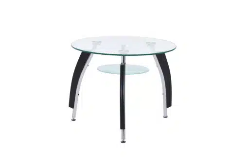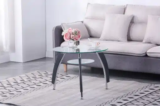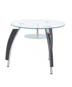 שולחן סלון מודרני מזכוכית עגולה שקופה משולב עם מדף תחתון עם זכוכית חלבית , מסגרת השולחן עשויה מכרום ניקל משולב עם אפור . שני פלטות הזכוכית של השולחן עשויות מזכוכית מחוסמת איכותית .
