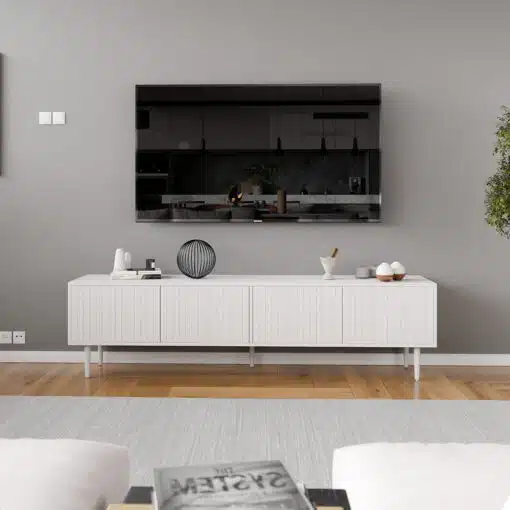 מזנון מעוצב זה הוא פריט ריהוט עכשווי המשלב מינימליזם סקנדינבי וחריטות פסים אנכיים מעודנות, היוצרות מראה אלגנטי ותלת-ממדי. המזנון מושלם למיקום תחת הטלוויזיה, עם משטח רחב באורך 180 ס"מ לאחסון פריטי נוי ואביזרים.