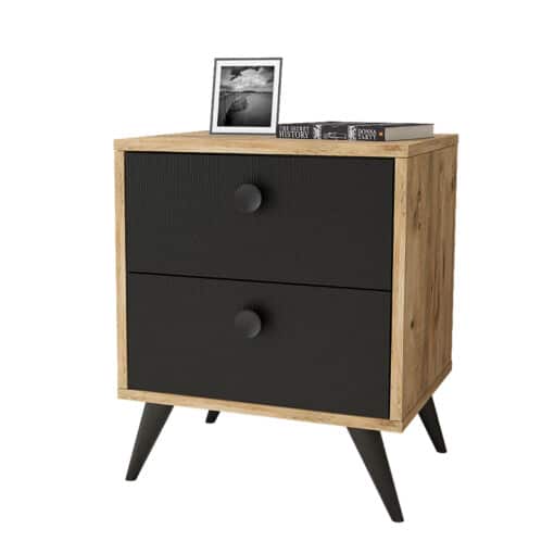 שידת לילה עם מגירות בצבע שחור משולב עם אורן עשויה מעץ מתועש עם חיפוי מלמין יצוק. עם שני מגירות מרווחות לאחסון בעיצוב קלאסי שישתלב עם מגוון עיצובים וסגנונות.